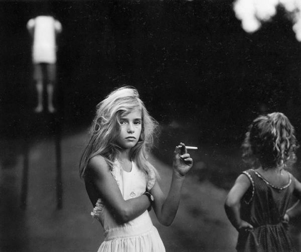 This particular piece was taken in 1989, the photograph features one of Mann’s daughters elegantly holding a candy cigarette between her fingers and her sister — facing back to the camera — who seems absorbed perhaps looking to something that looks like a person in stilts in the background.