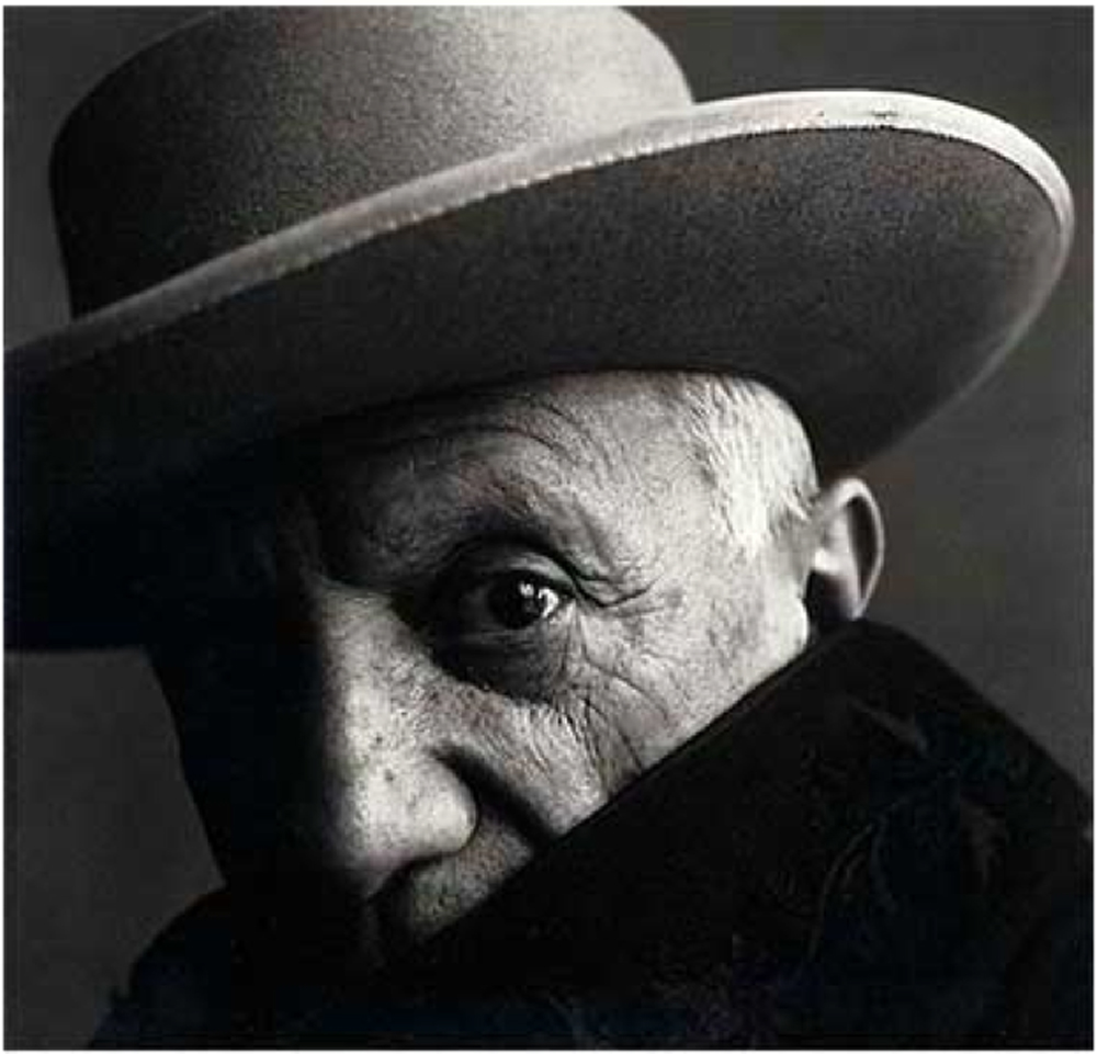 The portrait of Picasso is shot at a close range, the subject head is cropped in order to draw attention to the eyes. The harmonious play of geometric shapes is accentuated by the ingenious use of lights and shadows. As in most of Penn’s portraits the subject is posed against a plain background and lighted from the side.